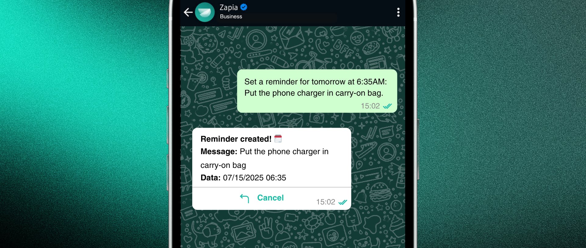 At Zapia, we listened when people said, “I need reminders in Zapia, now!” So we built it our way: simple, flexible, human-like.- Open your Zapia chat in WhatsApp or in the app.