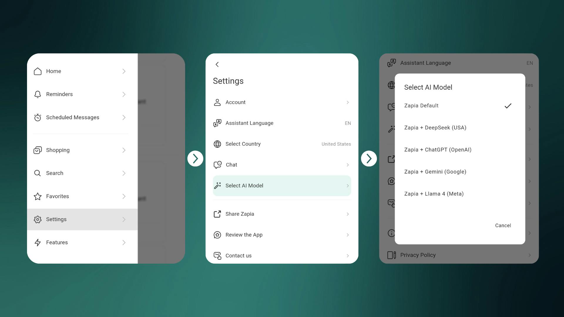 In the Zapia App, you can pick from a variety of AI language models (LLMs) like ChatGPT, Gemini, DeepSeek, Llama, and use them for free, based on what suits your needs. Want more analytical responses or creative ones? You get to choose the model that fits each situation.