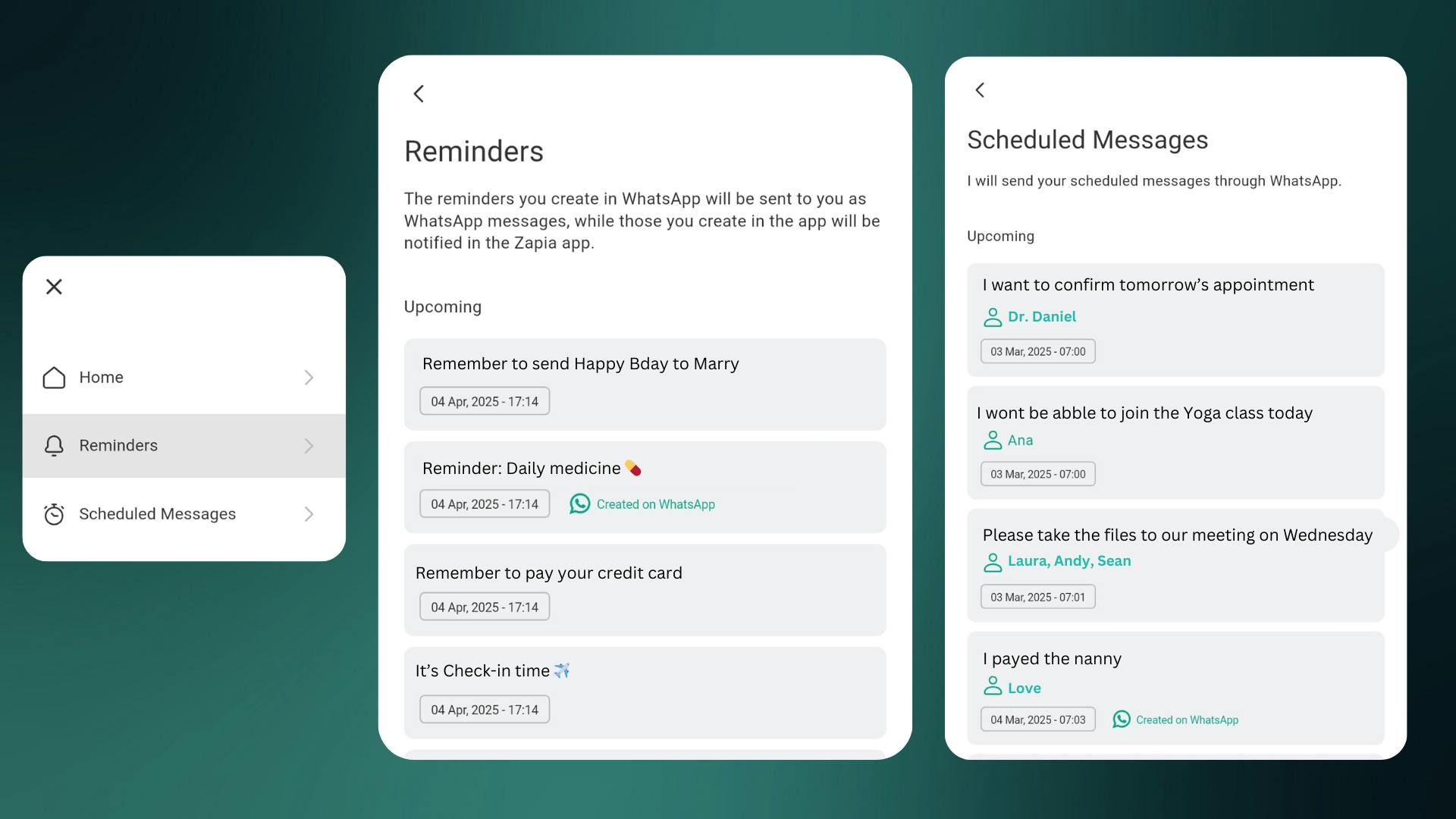 With the Zapia app, you can schedule WhatsApp messages for one or more contacts, set up one-time or recurring reminders, and view them all in an organized list. Even if you schedule a message or reminder through WhatsApp, you can check it within the app as long as your number is verified. It makes it so much easier to stay on top of your schedule and see everything you have planned for the week.