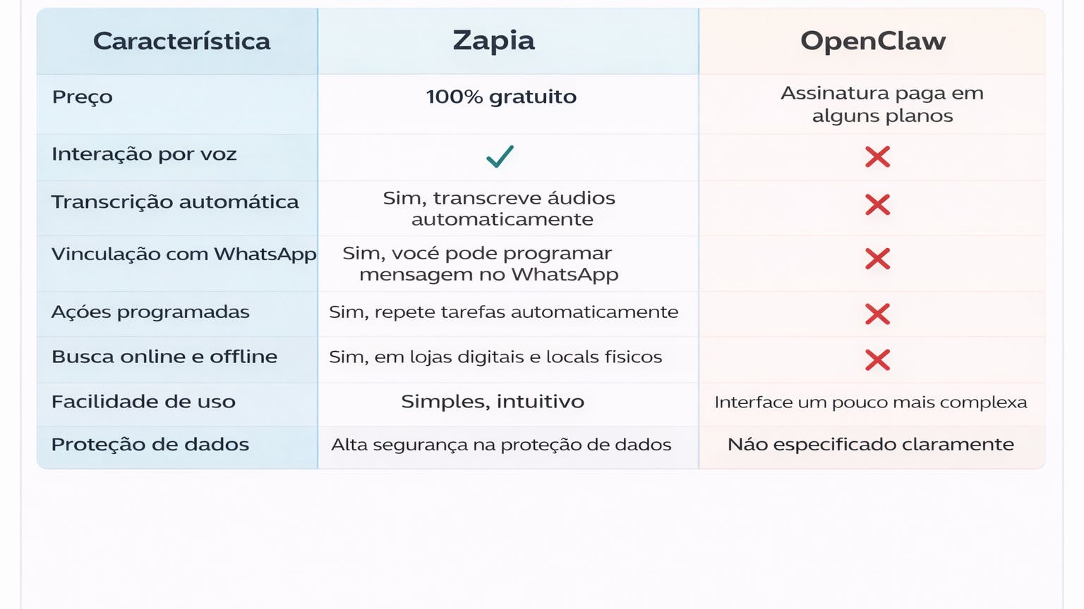 Uma das vantagens mais atrativas do Zapia é que ele é 100% gratuito. Não há necessidade de pagar por recursos avançados ou assinaturas para aproveitar suas funcionalidades. Isso o torna uma opção acessível para quem busca um assistente virtual sem custos adicionais.Já o OpenClaw oferece algumas funcionalidades apenas em planos pagos, o que pode ser uma desvantagem para quem busca uma solução totalmente gratuita.