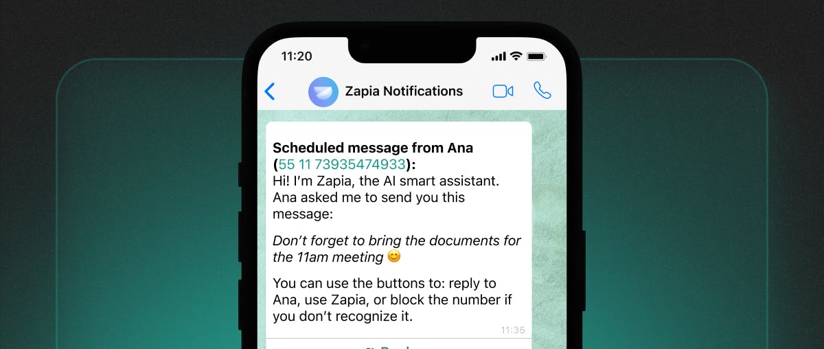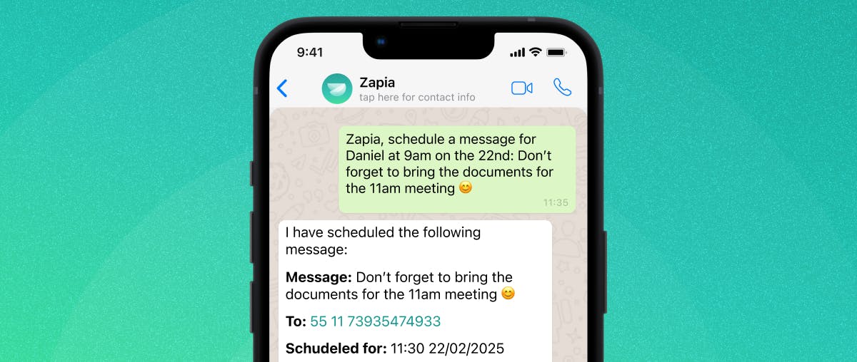 👉 "Zapia, schedule a message for Daniel at 9 AM on the 22nd: Don’t forget to bring the documents for the 11 AM meeting 😊"