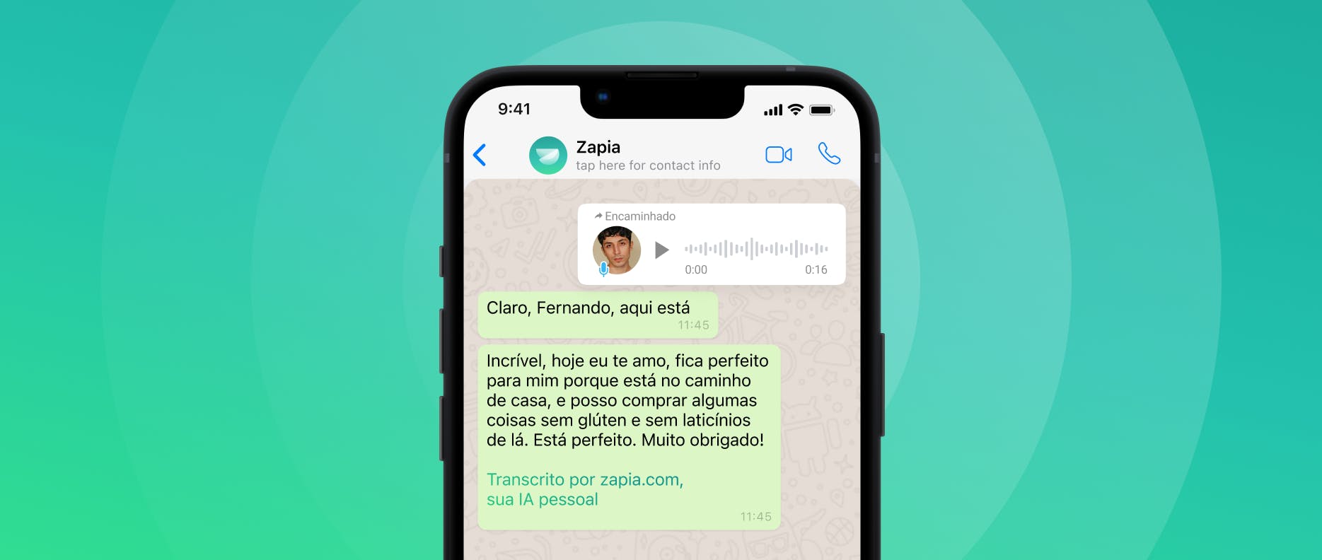 - Encaminhe o áudio do WhatsApp que deseja transcrever para o contato do Zapia.
